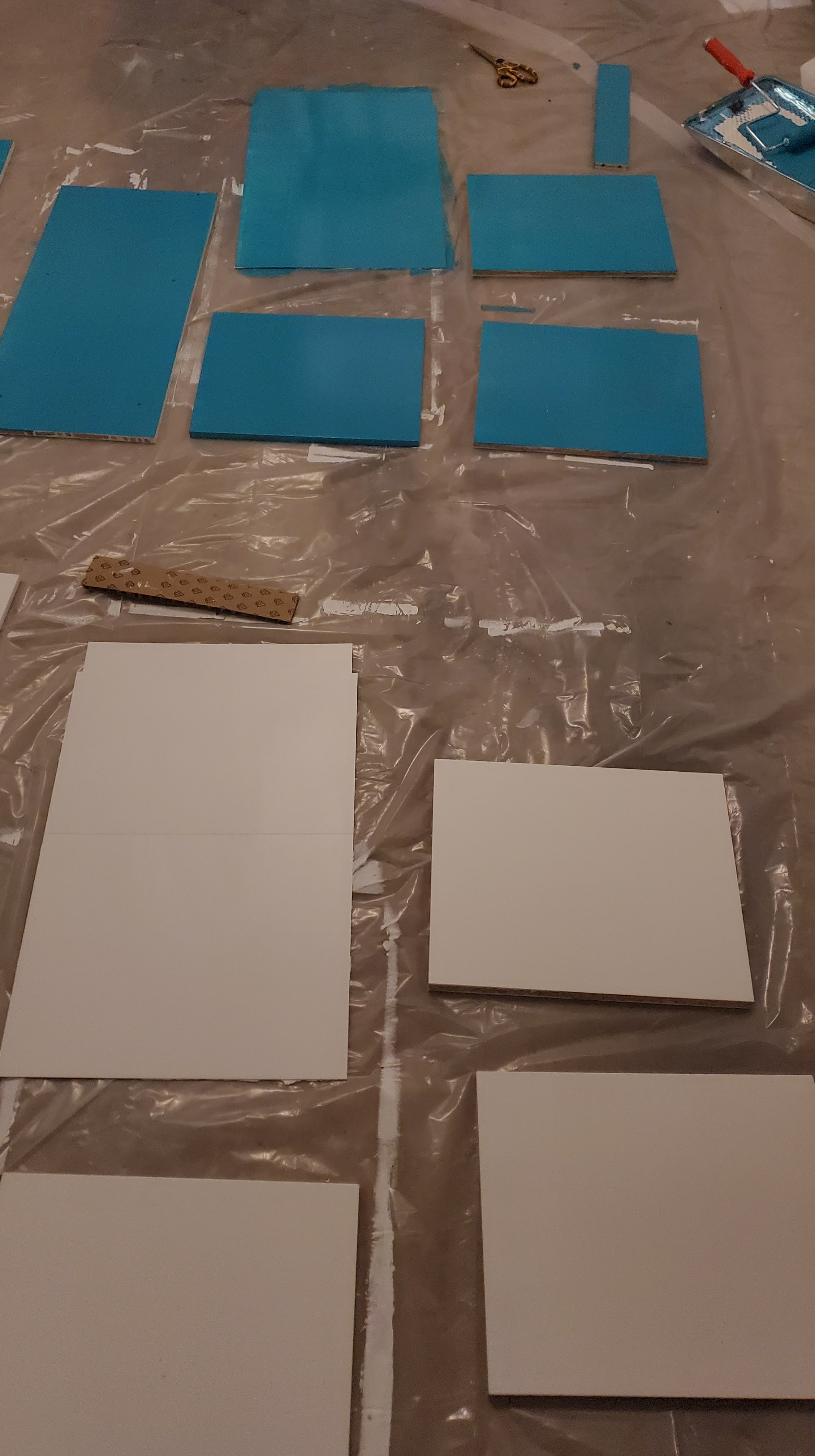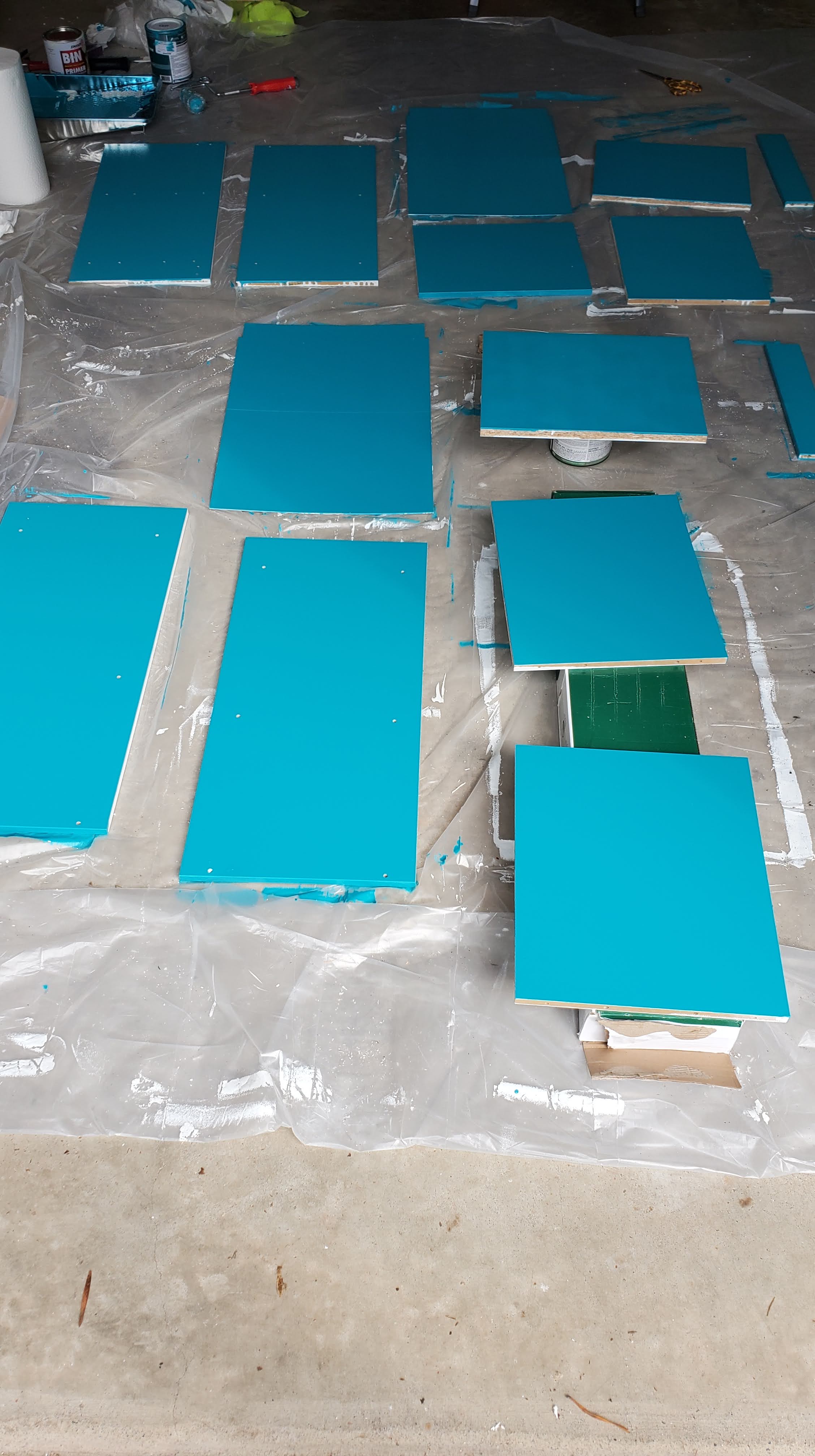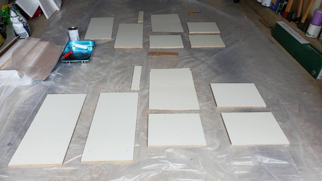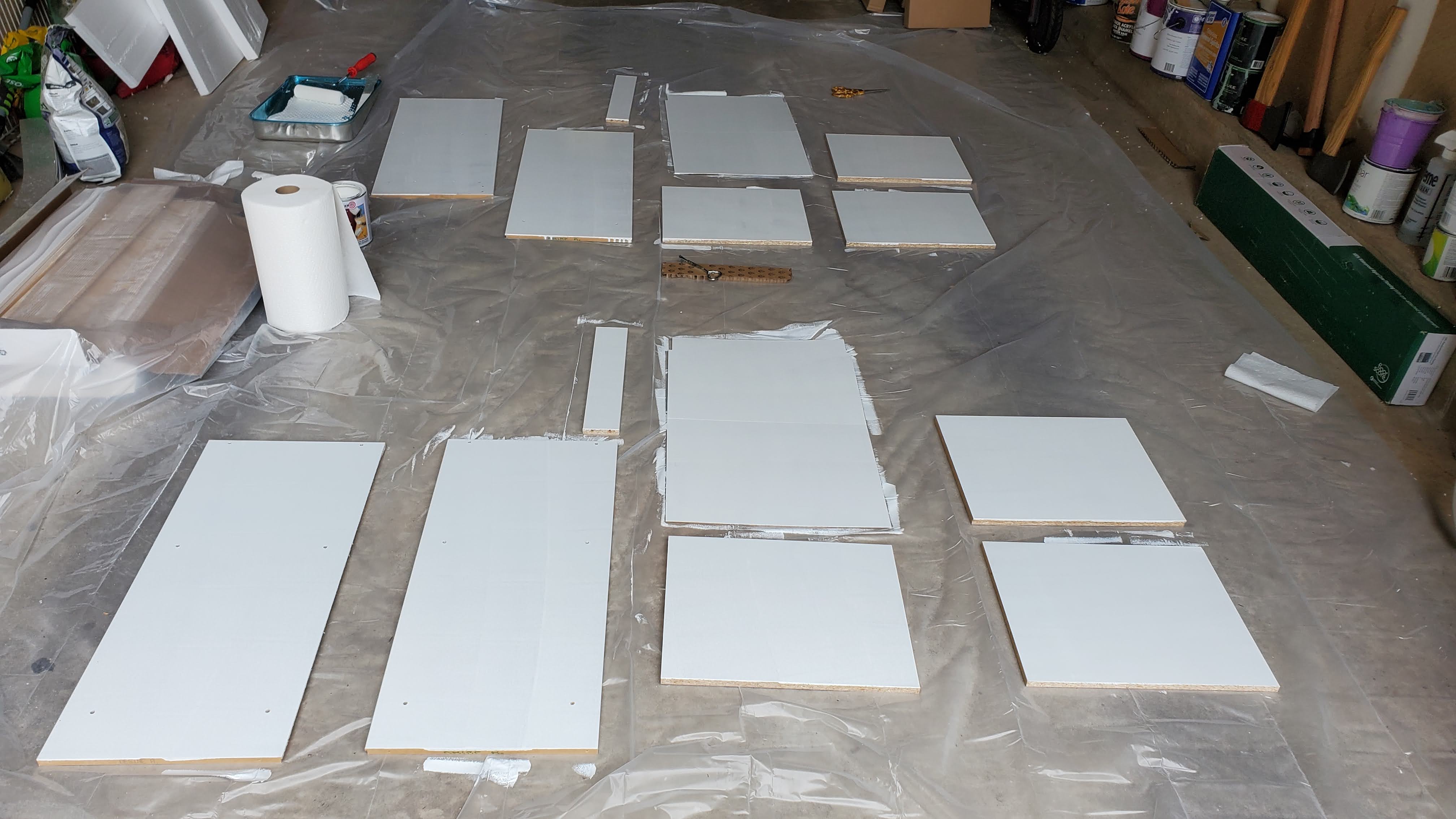 - Flip over the cabinet pieces and prime the faces and finished sides. Allow to dry.