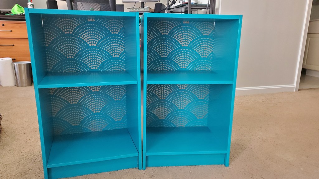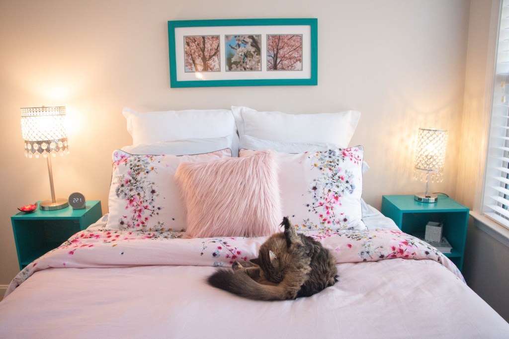 Now, cherry blossoms encourage the use of a lot of pink, so I still had to figure out a way to work in the teal of the frame. To my husband’s credit, he’s the one who suggested painting nightstands to match. I was all in, and so the research began. I had to hunt down reasonably priced nightstands of the right size and figure out all the supplies needed for the painting project.