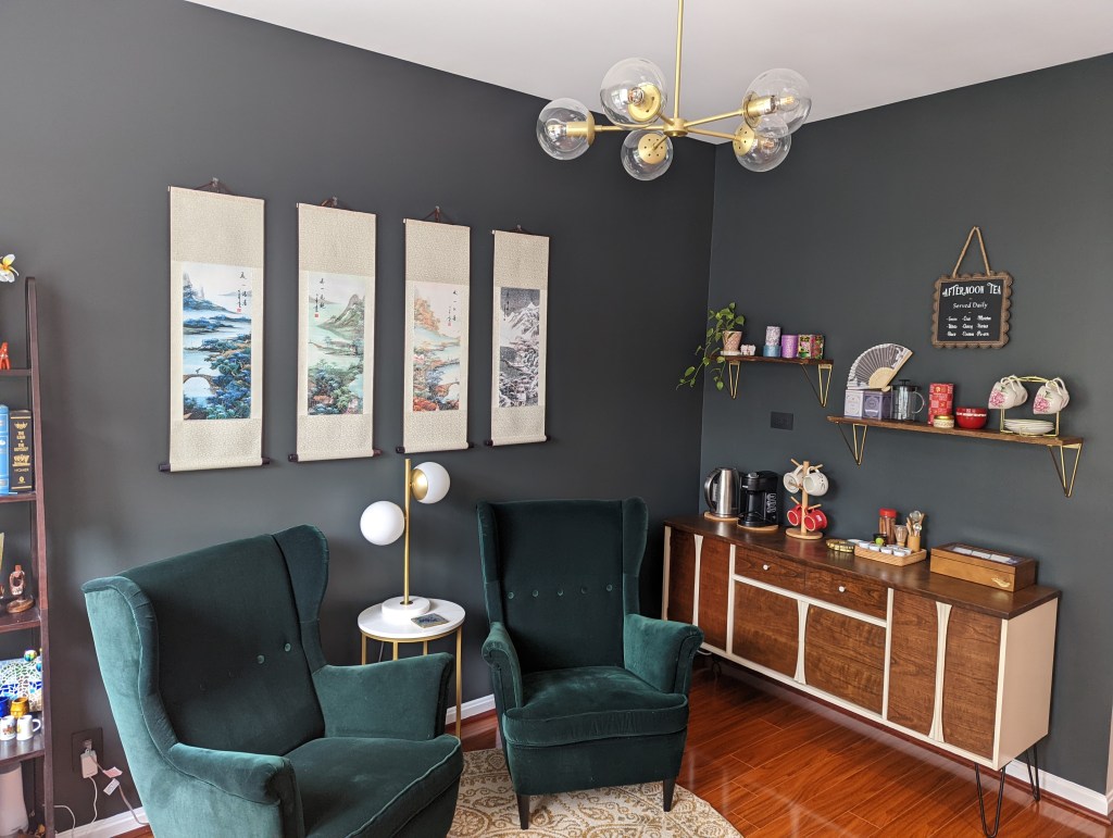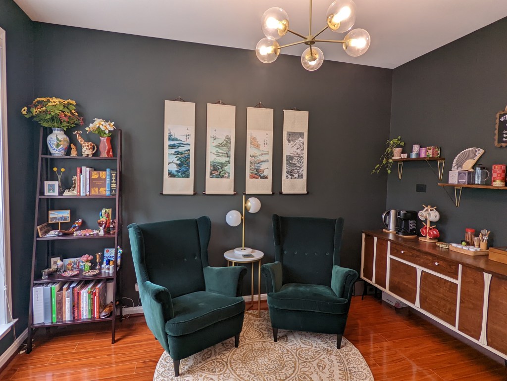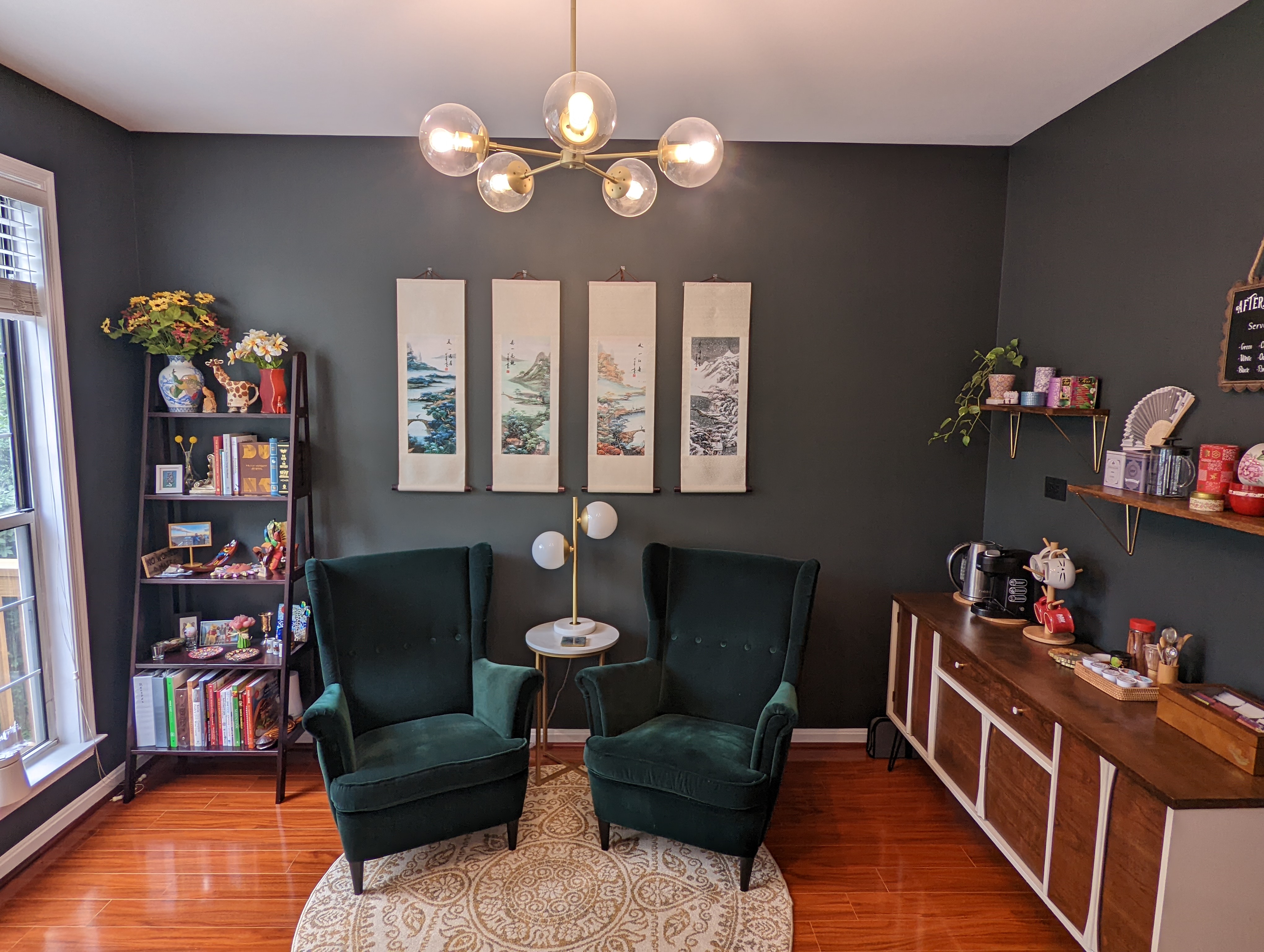 We were able to keep our ladder-style bookshelf in this space, we just moved it to the opposite side of the wall. We also knew we wanted to use our existing Japanese scrolls as decor. We bought those at the annual Sakura Matsuri festival in Washington, DC and we just love them!