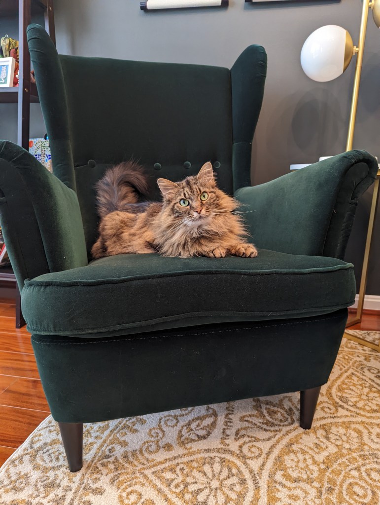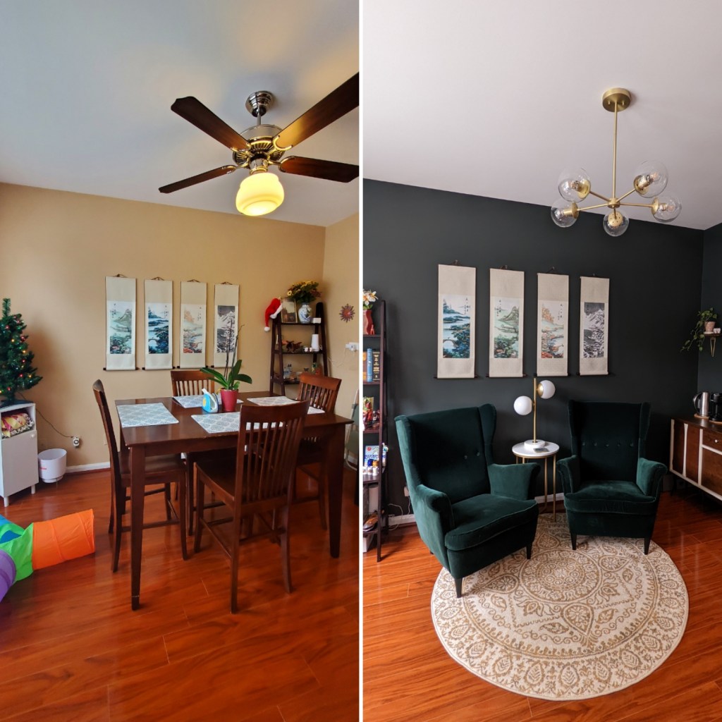 The Strandmon chairs from Ikea come in a variety of colors, patterns, and fabrics. Since our walls have green undertones, we thought the green velvet might be nice. I’m an extremely visual person, especially when it comes to home decor, so I Photoshopped them into the room before committing. Fortunately, we loved the look!