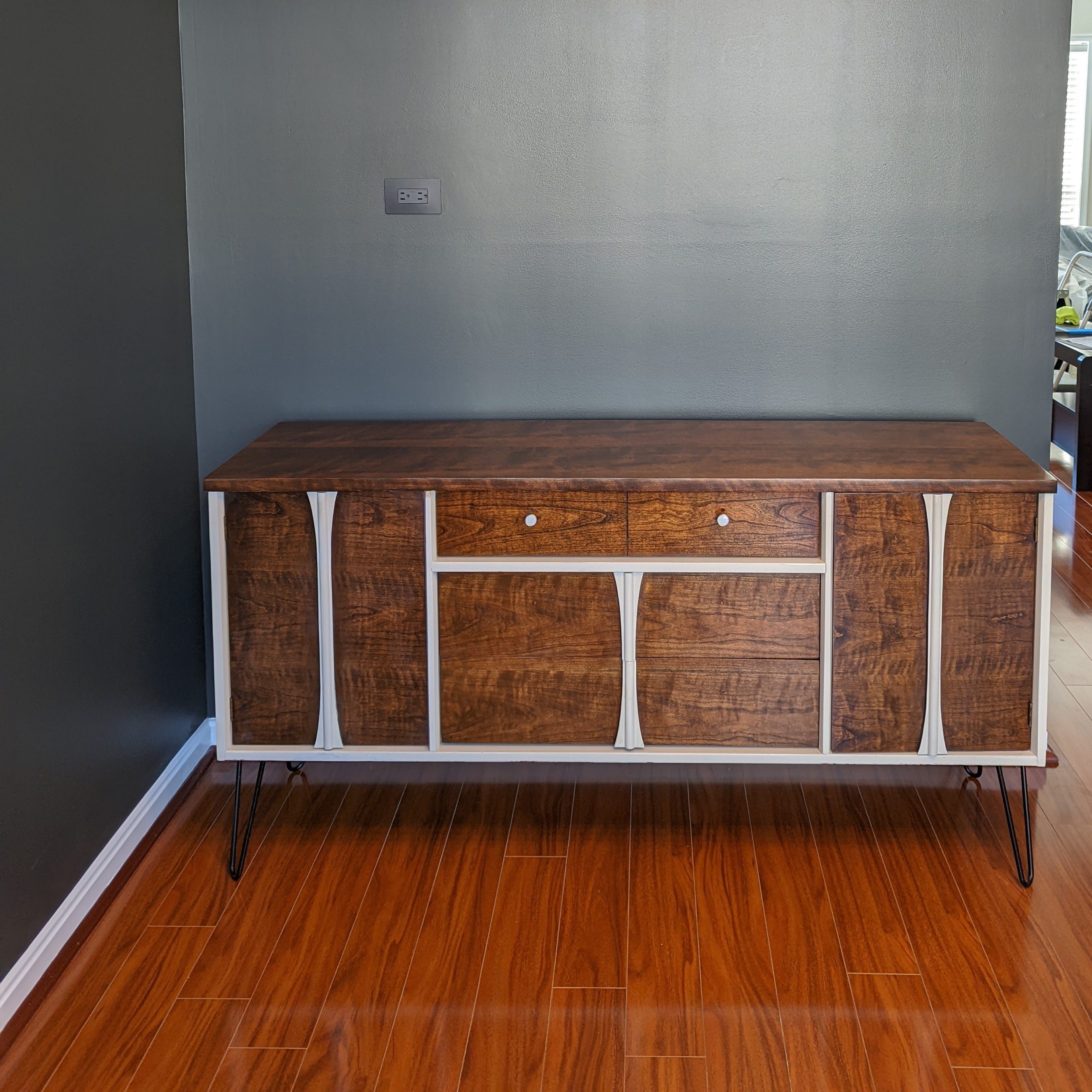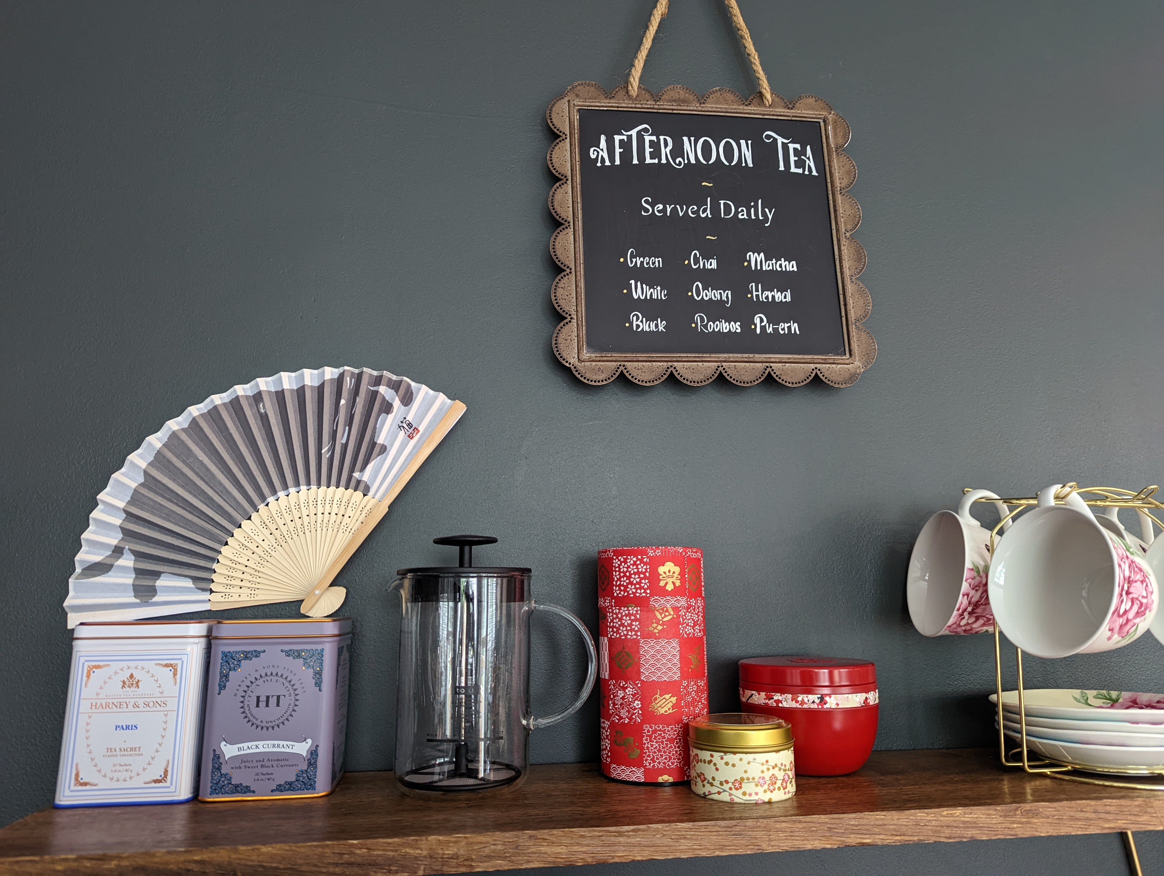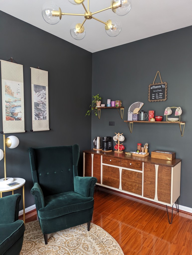 The base of this room was the tea station I wanted to create. After all, what is a cafe without hot drinks? This would be a place to display, store, and make all my tea (of course with some coffee options for guests… I’m a nice host 😊). We found a gorgeous mid-century modern buffet from the 1970’s on Facebook Marketplace and pounced on it! It fit perfectly on the side wall.