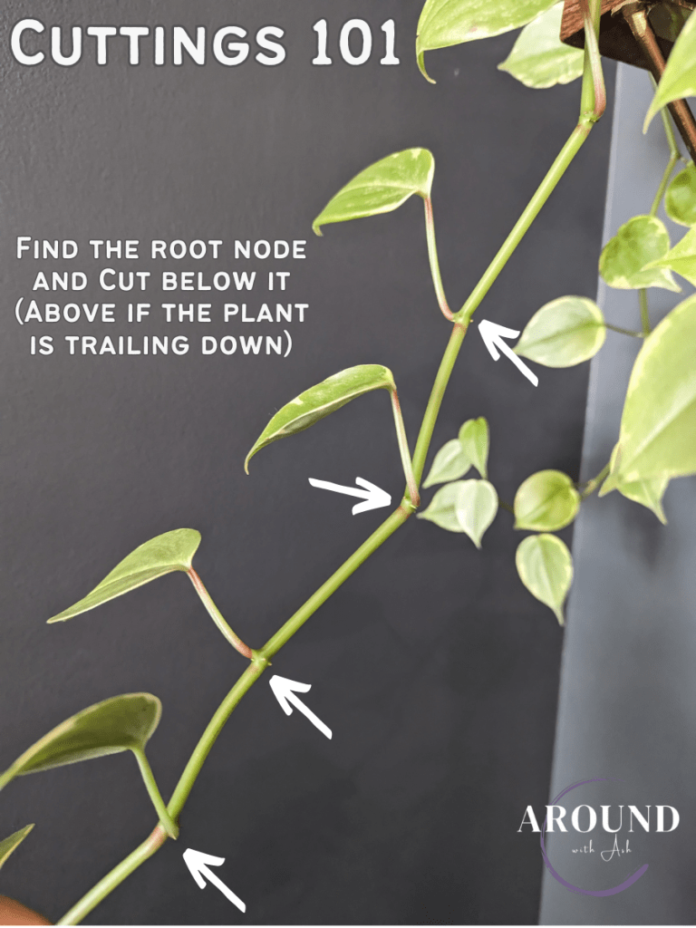 Perspective is Everything: If you are making a cutting from a trailing plant, and the plant is trailing down, you’ll want to cut above the node. Basically, you want to ensure the bottom of your cutting is a node because roots grow more easily here. You can have more than one node on your cutting.