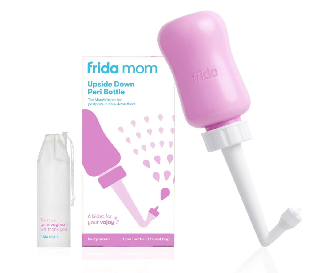 Upside-Down Peri Bottle: The hospital gives you a squeeze bottle but this upside-down version allows for better cleaning. It’s kind of like a handheld bidet. You won’t want to be without!
