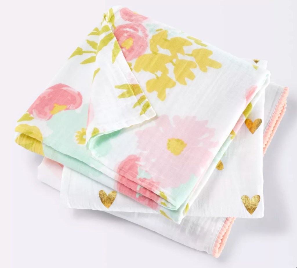 Muslin Swaddle Blankets: These can be used for swaddling, but they are so, so versatile. I use one of these to cover my nursing pillows, we use it as a blanket in the car seat or stroller, and it can wipe up spit-up. The muslin fabric is lightweight and the pattern options are very cute.